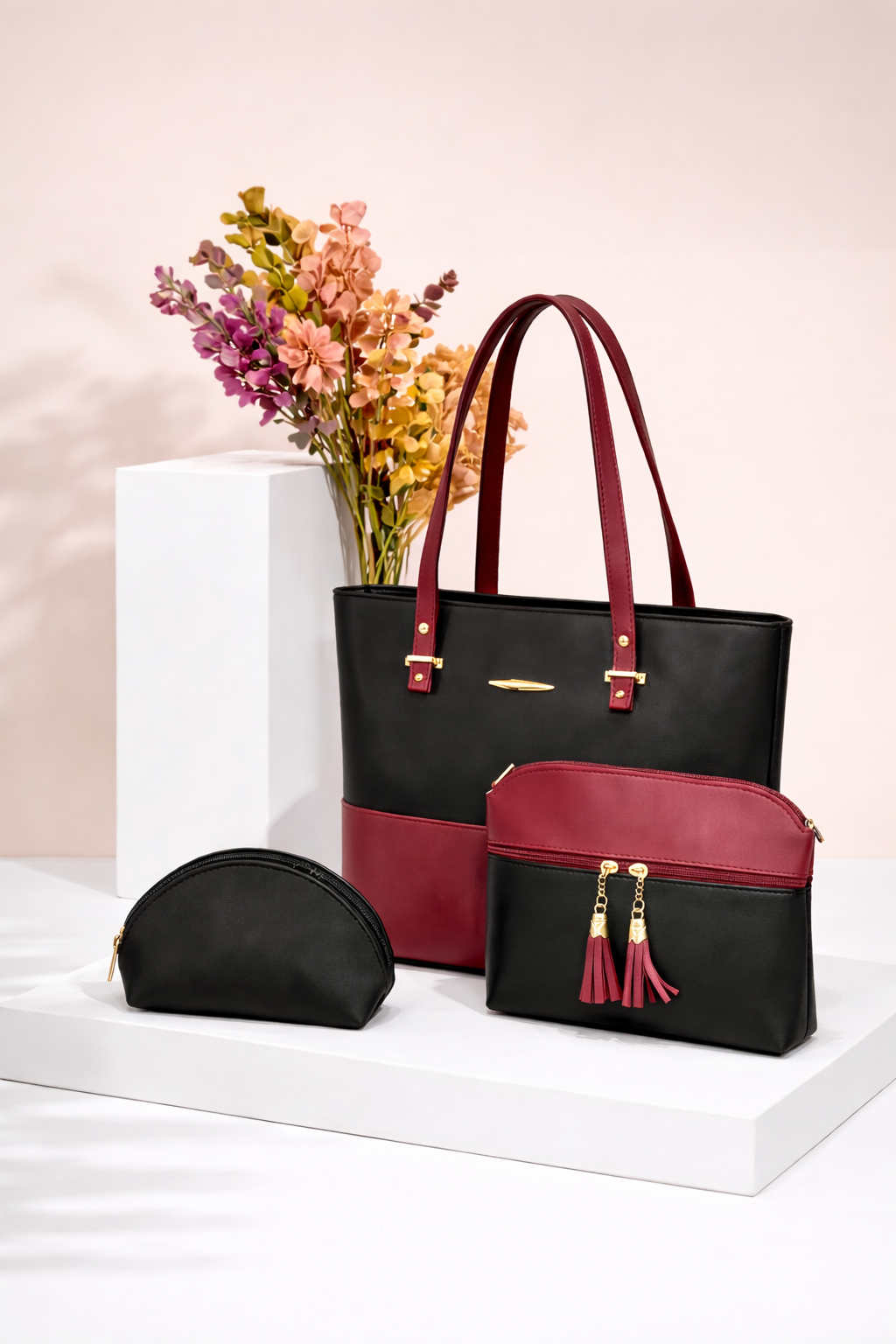 Upgrade your everyday style with the SC Trio Tote Set – Black & Maroon, a premium 3-piece bag set designed for elegance and practicality.