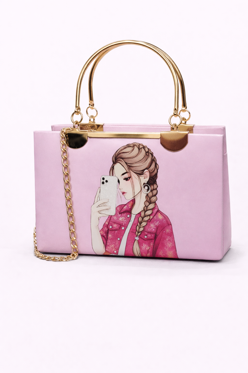 STYLE CARRY Selfie Girl Chain Handbag – Pink is a trendy and elegant handbag designed for women who love fashionable statement pieces. It features a beautiful selfie girl print on the front with a premium glossy finish. The gold-tone metal handle gives it a luxury look, while the detachable chain strap offers comfortable shoulder carry. Compact yet spacious enough for essentials like phone, wallet, keys, and makeup — ideal for outings, parties, and casual wear.
